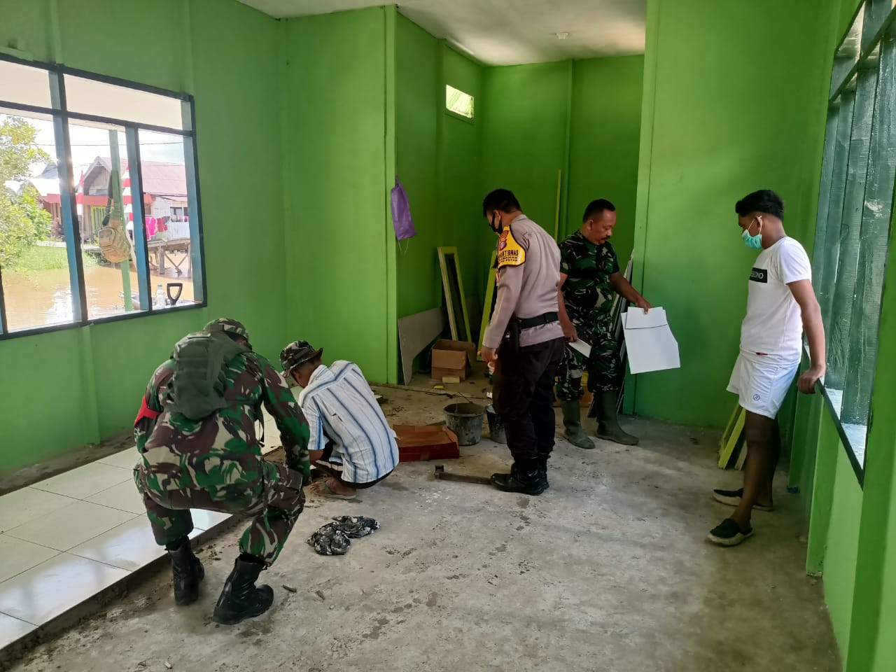 Dengan pemasangan keramik yang dilakukan oleh tukang desa setempat yang sudah berpengalaman ini serta dibantu oleh anggota satgas, kepolisian dan juga warga desa semua dikerjakan dengan baik dan rapi.
