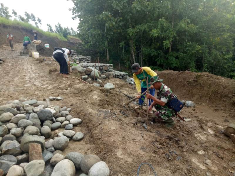 Tampak Serda Tolani, anggota Satgas TMMD dan Ketua Karang Taruna Sakti Jatiroyom, Koko Widiyanto (36) melaksanakan penghijauan tepatnya di bronjong kawat I yang panjangnya 28 meter dan tinggi 5 meter, terletak 150 meter dari nol Makadam serta bronjong II (20 x tinggi 6 meter) di titik 200 meter dari nol Makadam sepanjang 805 meter lebar 2,5 meter. Selasa (19/3/2019).