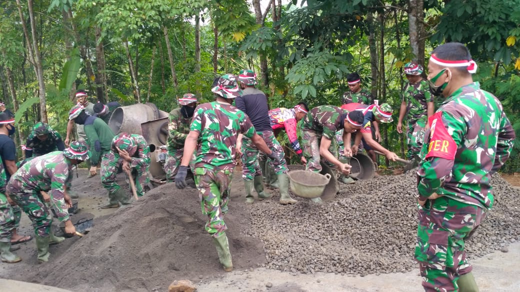 Purworejo — Satgas TMMD Reguler ke-109 Kodim 0708/Purworejo tidak mau ketinggalan dalam rangka memeriahkan HUT TNI ke-75. Sambil bekerja menyelesaikan proyek pembangunan jalan rabat beton, para anggota Satgas TMMD menggunakan ikat kepala pita merah putih, Selasa (06/10/2020).