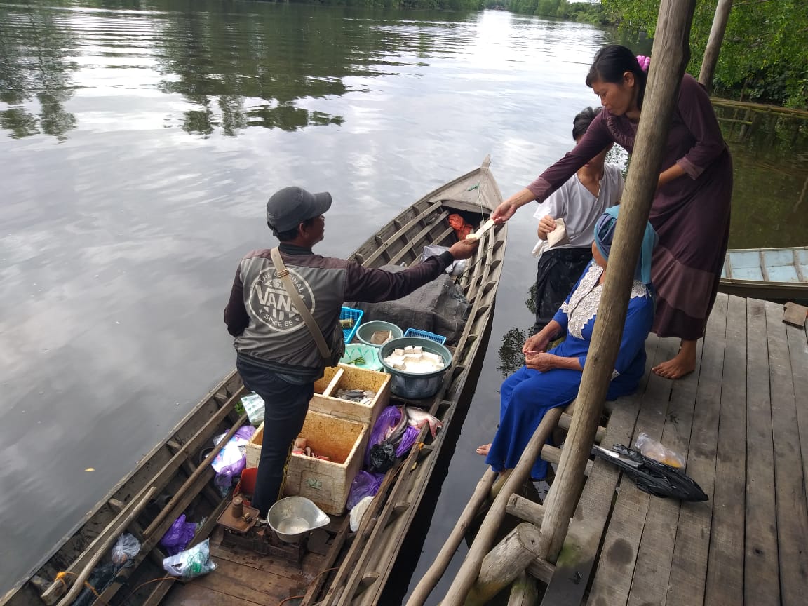 Kapuas – Ibu Ibu masyarakat Desa Baguntan raya dalam berbelanja harus antri di Dermaga menunggu penjual lauk pauk dan sayuran yang sedang berjualan dengan menggunakan perahu.