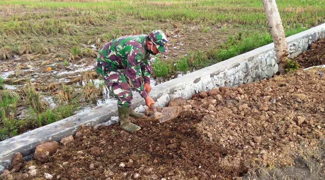 Untuk itu, tidak ingin berteori, Serka Nur Abidin, nekat memegang cangkul, dan meratakan timbunan tanah yang ada di sekitar bangunan talud, di Dukuh Jlubang, Desa Pantirejo.