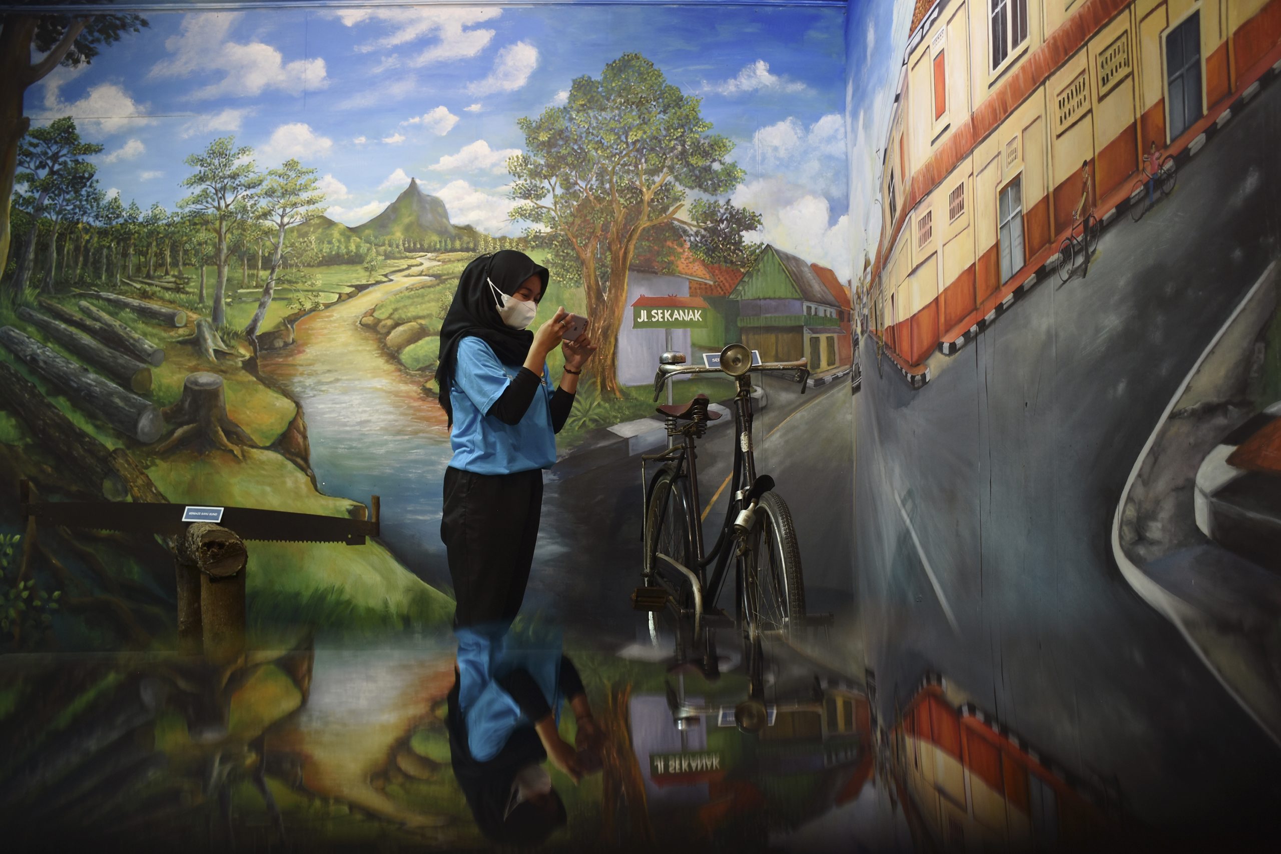 Galery Hibah – Seorang pengunjung nampak tengah memotret sepada antik yang bedara di galery Hibah Museum Balaputra Dewa Jalan Srijaya 1 Km 5 Palembang, Jumat (19/11), Ruang galery Hibah kini di desain dengan inovasi dinding lukisan kota Palembang, Sehingga tampilan galery Hibah ini menarik pengunjung untuk dijadikan sarana berfoto dan berselfie ria.