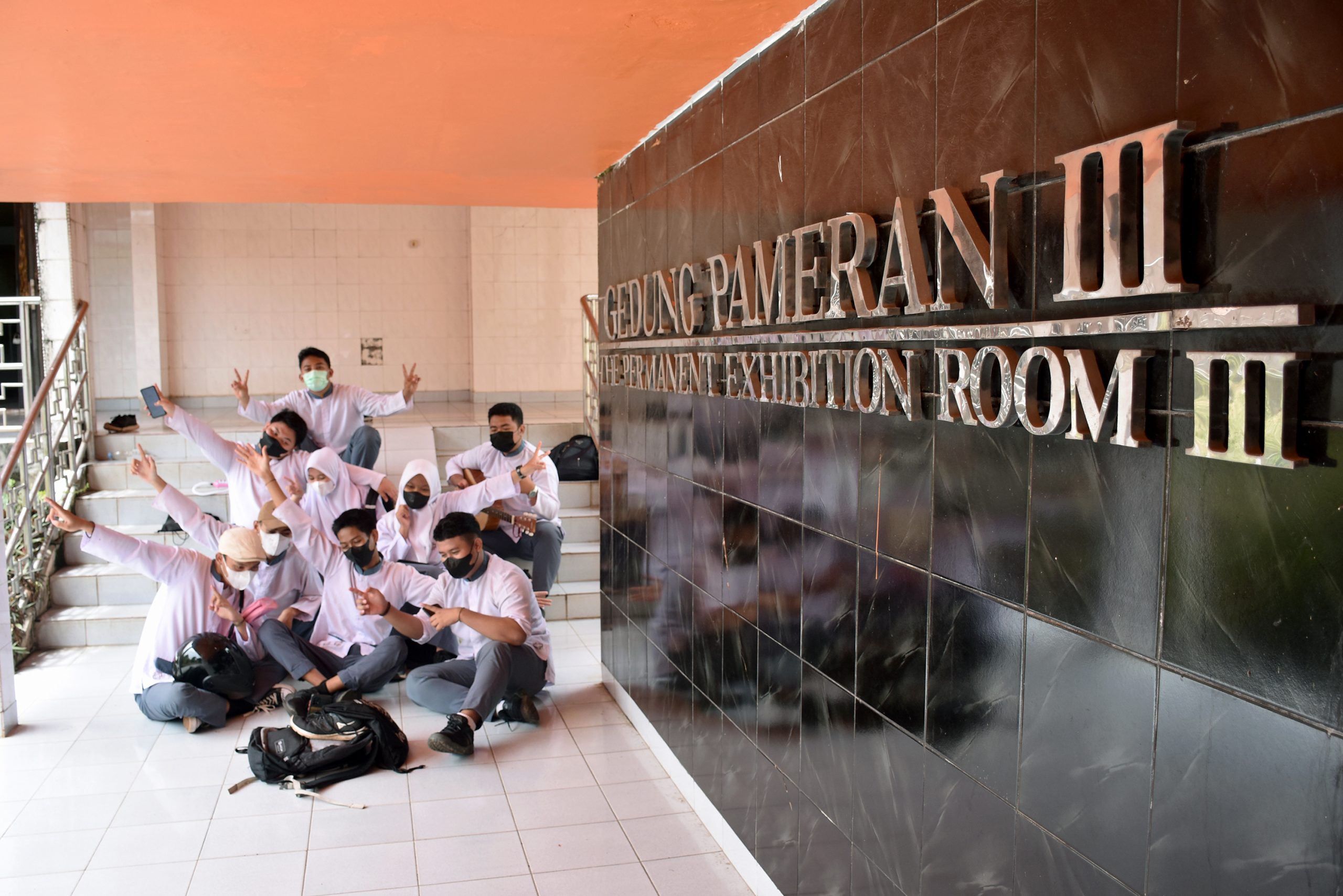 Melepas Penat- Sejumlah Siswa sedang berselfie dan berekspresi di sekitaran halaman Museum Balaputra Dewa Jl Srijaya 1 KM 5 Palembang, Tak hanya menjadi tempat edukasi, Museum Balaputra Dewa juga menjadi tempat beristirahat, melepas penat dan juga kegiatan syuting untuk para siswa ataupun pengunjung.