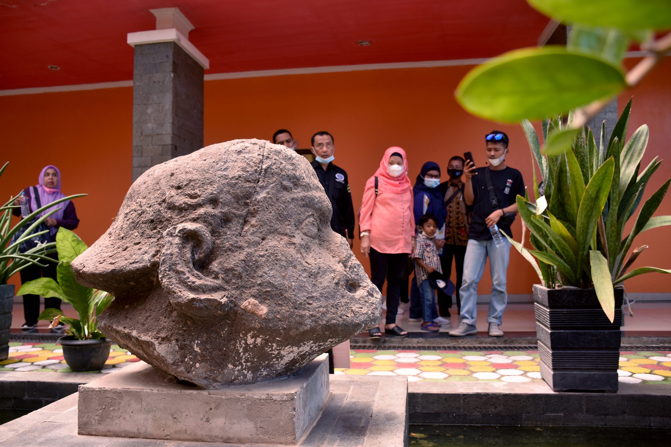 Taman Arca – Beberapa pengunjung tengah melihat Arca di seputar taman Museum Balaputra Dewa Jl Srijaya 1 km 5 Palembang, Taman Arca ini membuat halaman sekitar museum menjadi unik dan menarik bagi pengunjung.