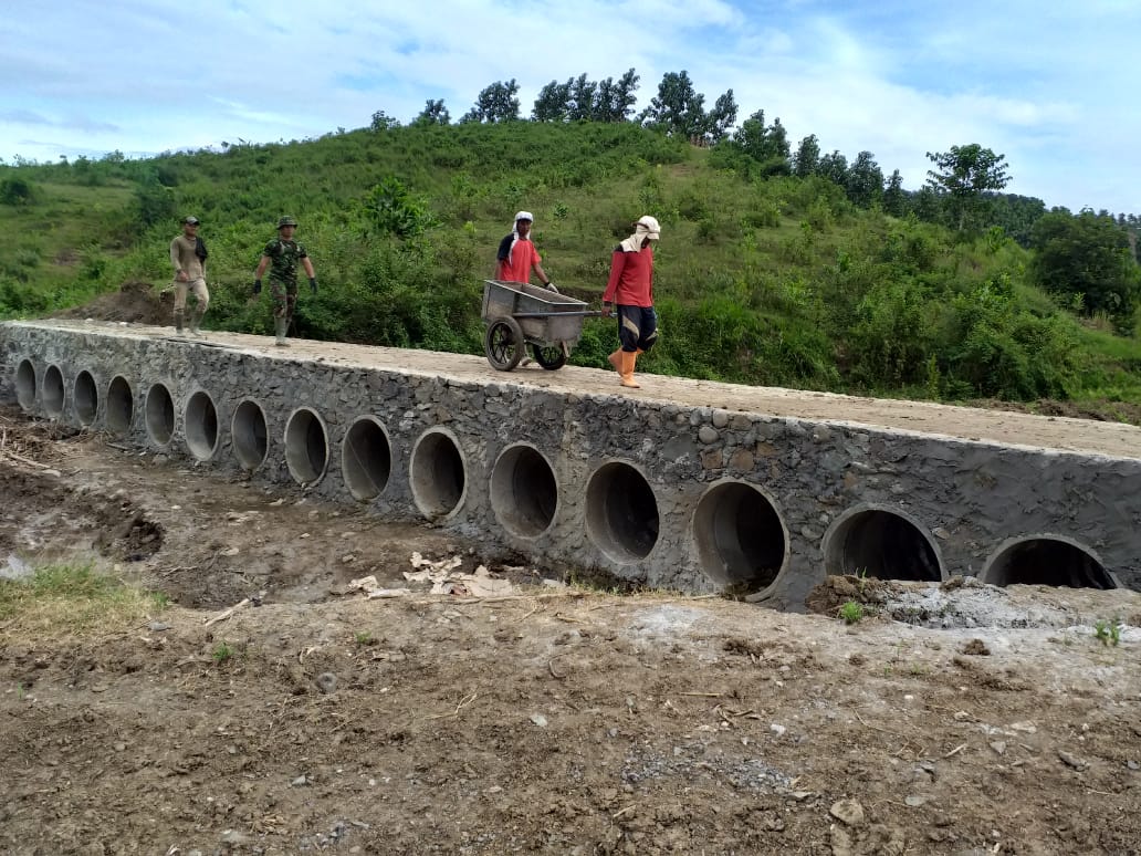 Adalah anggota satgas yang sedang mengambil material untuk digunakan pada pekerjaan saluran drainase dan rabat beton, Koptu Harlin anggota satgas dari batalyon 407/Padmakusuma mengaku sudah sangat terbantu dengan jembatan limpas yang sudah jadi di kerjakan.