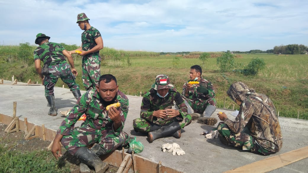 Beberapa anggota Satgas saat istirahat tampak terlihat menikmati hidangan jagung rebus. Memang seiring berbarengan dengan TMMD masyarakat pun sedang panen diantaranya sebagian kecil memanen jagung yang ditanam mereka diladang. Sehingga tidak sedikit dari warga yang memberikan hidangan jagung rebus yang menjadi ekstra pudding pada siang hari didaerah pedesaan. Rabu (30/06/2021).