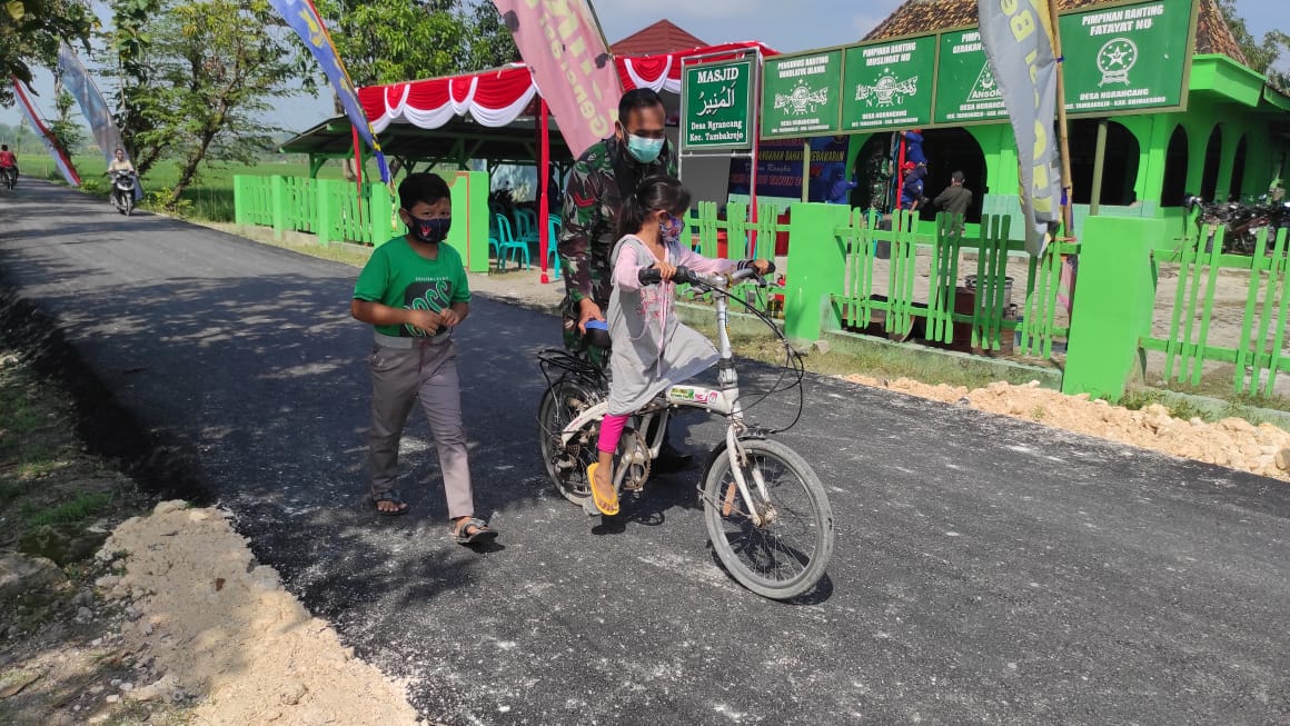 Jajal Jalan Aspal Baru, Satgas TMMD Bojonegoro Ajari Anak Ngrancang Bersepeda