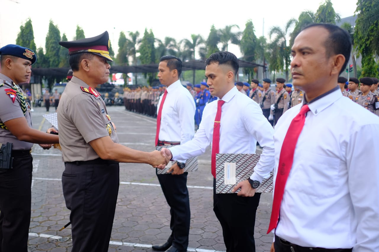 Setalah upacara selesai dilaksanakan dilanjutkan dengan pemberian Reword kepada Anggota yang berprestasi dari jajaran Polresta Pekanbaru oleh Kapolda Riau.