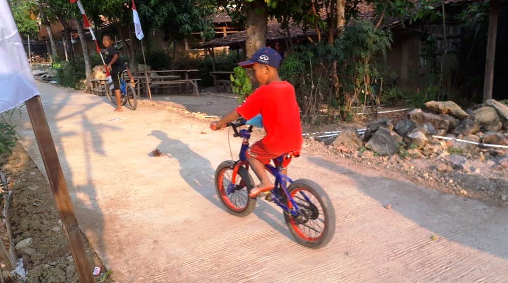 Anton (8), salahsatu anak warga Dusun Kenteng RT 1/ RW 7, Desa Tambakselo, mengaku, sejak jalan selesai dibangun Tentara, dirinya semakin leluasa bisa main sepeda.