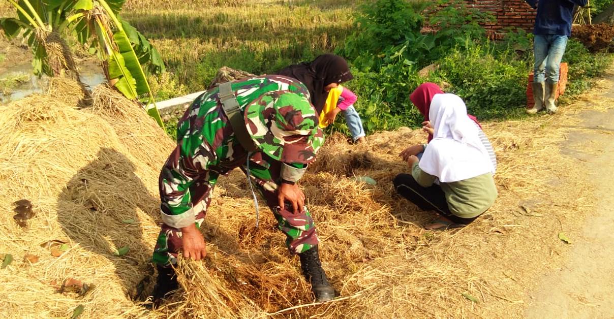 Memanfaatkan momen, di Desa Pantirejo yang sedang panen jamur merang, menyusul usai panen raya padi, Serda Daryono menyempatkan diri untuk membantu sejumlah anak di desa itu yang tengah mencari jamur merang.