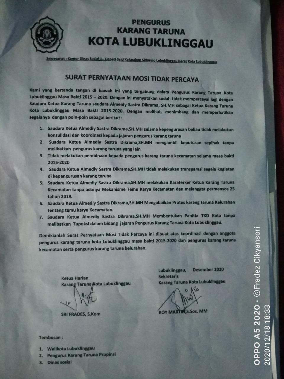 Hal ini pun, dikhawatirkan dapat mengganggu jalannya TKD yang dijadwalkan sebentar lagi. Mosi tidak percaya yang dikeluarkan oleh pengurus terhadap Ketua Karang Taruna Kota Lubuklinggau saat ini, Almeidy Sastra Dikrama (Midun) disebabkan banyak point alasan.