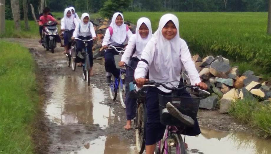 Sementara itu, beberapa siswi lainnya tampak menaiki sepedanya pelan,sementara matanya melototi jalan yang penuh genangan, sebagian lumpur bekas dilalui kendaraan. ”Kalau tidak hati-hati, bisa-bisa celaka. Kalau sampai jatuh dan masuk kubangan air, susah karena seragam ini harus saya pakai besok paginya kembali,” tutur Novi, yang juga siswi SMPN 3 Sragi, warga Dukuh Sutosari, Desa Pantirejo.