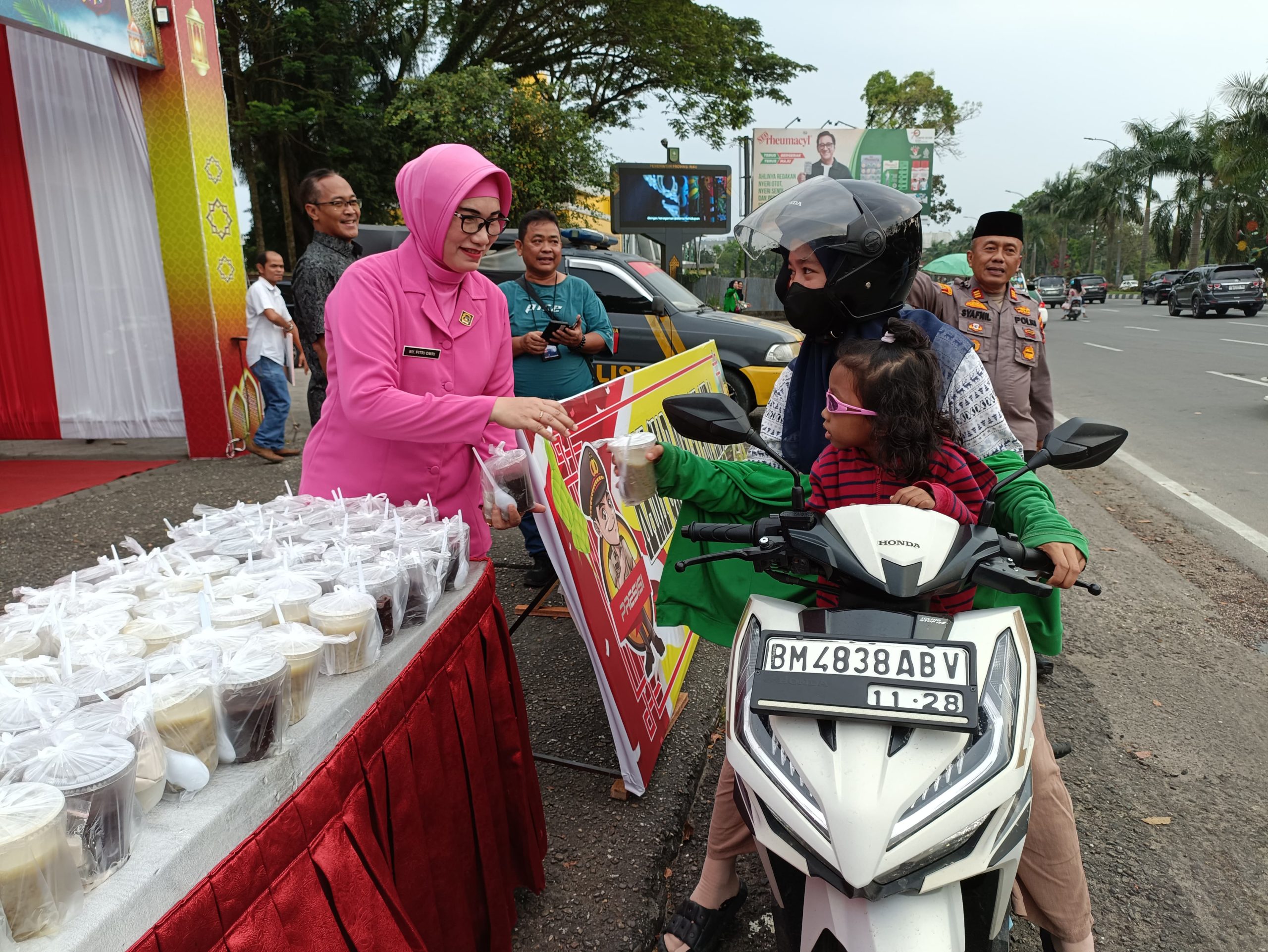 Kapolsek Bukit Raya dan Ketua Bhayangkari Ranting Bukit Raya Bagi-Bagi Takjil Gratis ke Pengendara Jalan.