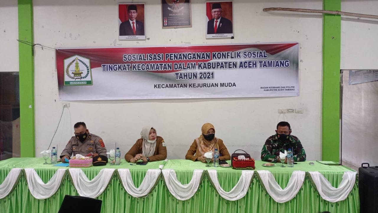 Sosialiasi tentang penanganan konflik dihadiri oleh Camat Kejuruan muda Rusni Devi Aryanti M,S.STP.M.M., Kepala Badan Kesatuan Bangsa dan Politik Kabupaten Aceh Tamiang Agusliana Devita ,S.STP,M.Si., Danramil 07/Kjm Kapten Inf Nunu Rukmana, Kapolsek Kejuruan muda diwakili Oleh Ipda Sbahri, Tokoh Agama,Tokoh Masyarakat,Tokoh Pemuda,Tokoh Adat,Tokoh Wanita Se Kecamatan Kejujuran Muda.