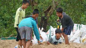 Untuk menghilangkan kejenuhan, merekapun mulai bermain pasir sambil bersorak. Bahkan ada yang membuat patung dari pasir sungai.