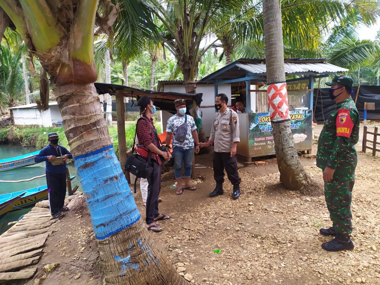 Terlihat Babinsa Koramil 12/ Pringkuku dan Polsek Pringkuku melakukan woro-woro di pasar tradisional ,Beji Park, serta di wisata pantai watu karung yang berada di wilayah Kecamatan Pringkuku,Kabupaten Pacitan.