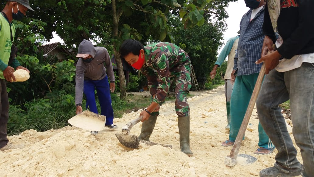 Anggota Satgas TMMD 110 Kodim 0813/Bojonegoro, Serda Eko bersama Masyarkat Bergotong royong bersama warga sekitar di Desa Ngrancang Kecamatan Tambakrejo.