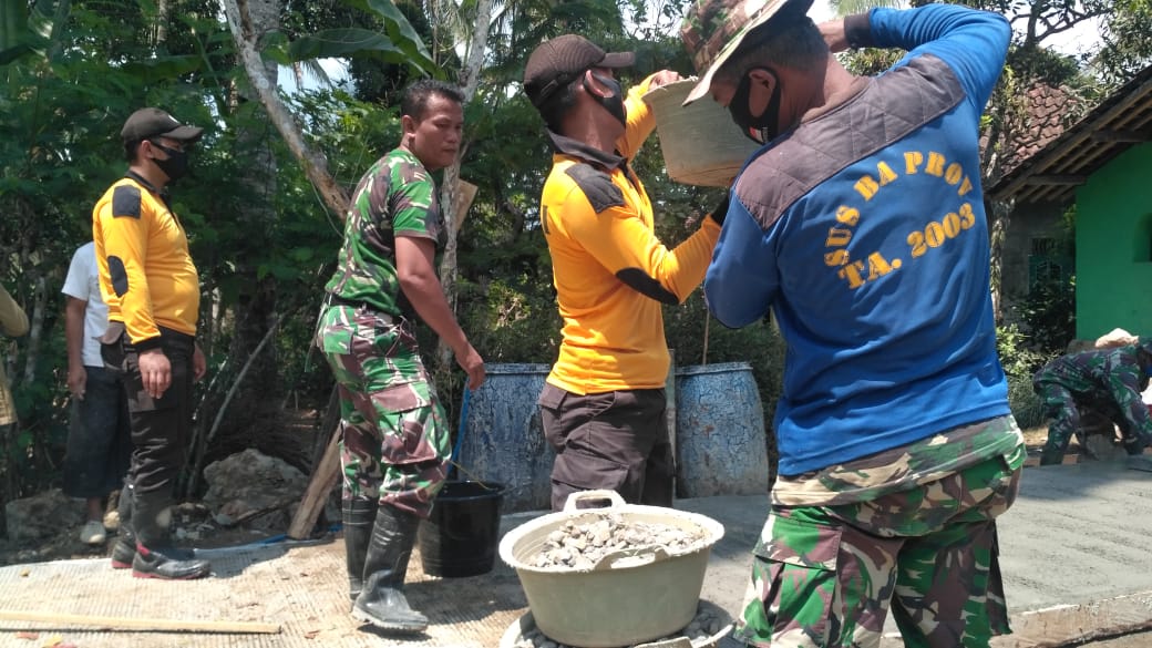 Purworejo — Kekompakan Satgas pra-TMMD Kodim 0708/Purworejo bersama anggota Polri dan warga masyarakat terlihat jelas dalam mengerjakan proses pengecoran jalan di lokasi yang akan dilaksanakan TMMD Reguler ke-109 TA 2020 di Desa Sedayu, Kecamatan Loano, Kabupaten Purworejo, Senin (21/09/2020).