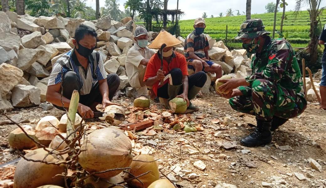 Saat memasuki waktu istirahat, Pak Damin (52) warga Dusun Trugo, Desa Jatiwarno membawa kelapa muda untuk disuguhkan kepada Satgas TMMD 109 dan warga yang sedang melaksanakan pembuatan pondasi jembatan satu.