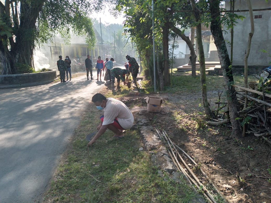 Namun pagi ini Peltu Agung Widagdo selaku tertua dalam pengambil apel, berinisiatif mengajak anggota satgas Pra TMMD bersama masyarakat untuk sejenak membersihkan lingkungan disekitar kantor Balai Desa dan jalan sekitar, Senin (07/06/2021).