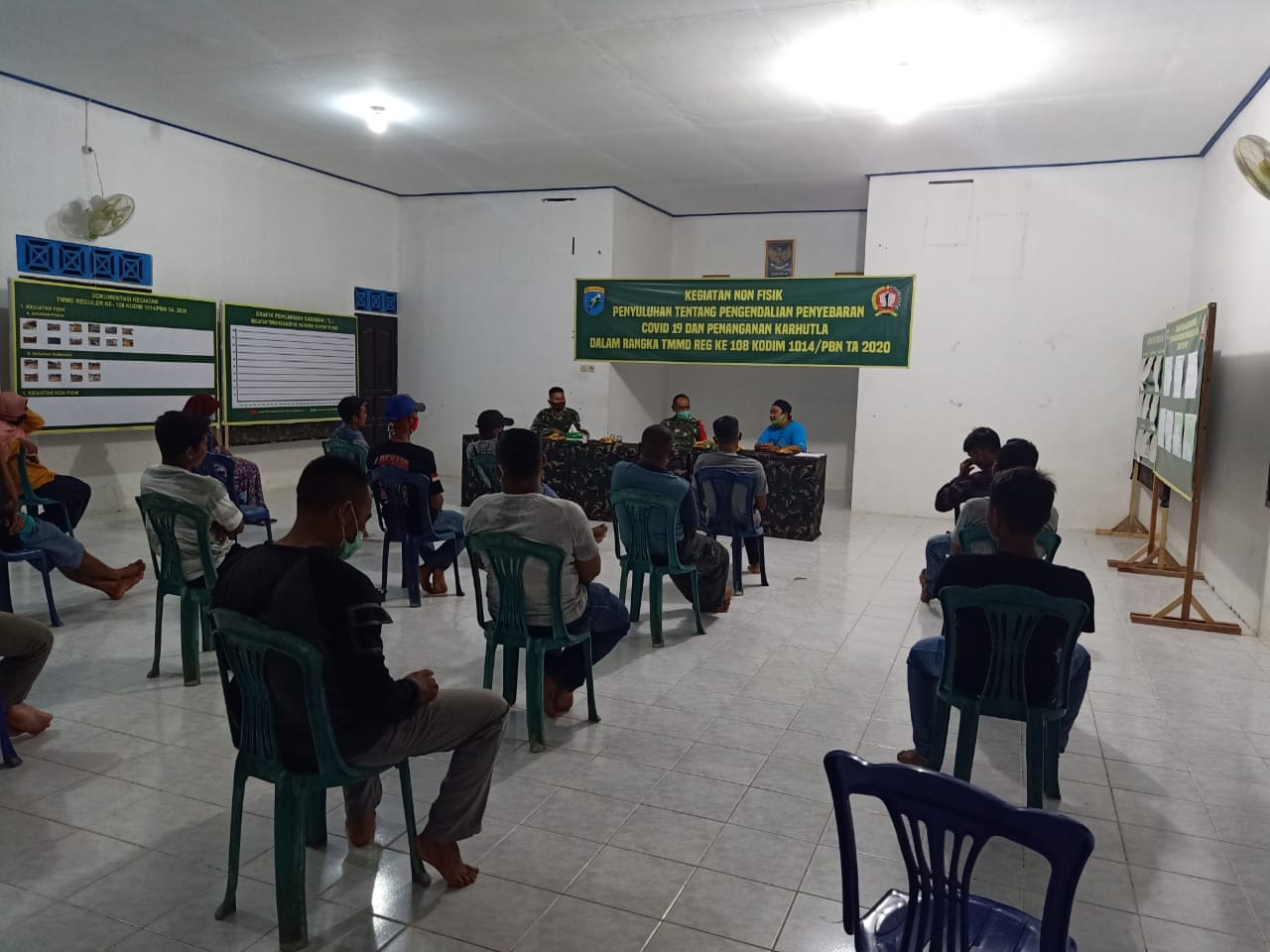 Anggota TMMD melakukan sosialisasi tentang COVID 19 dan Pencegahan Karhutla,dan ada nya kegiatan ini langsung di pimpin oleh pasi Ter KODIM 1014 sekaligus selaku kordinator TMMD dan di dampingi oleh DANSSK/Lettu.CBA Mulyani dan juga ikut serta sekdes desa bangun jaya.