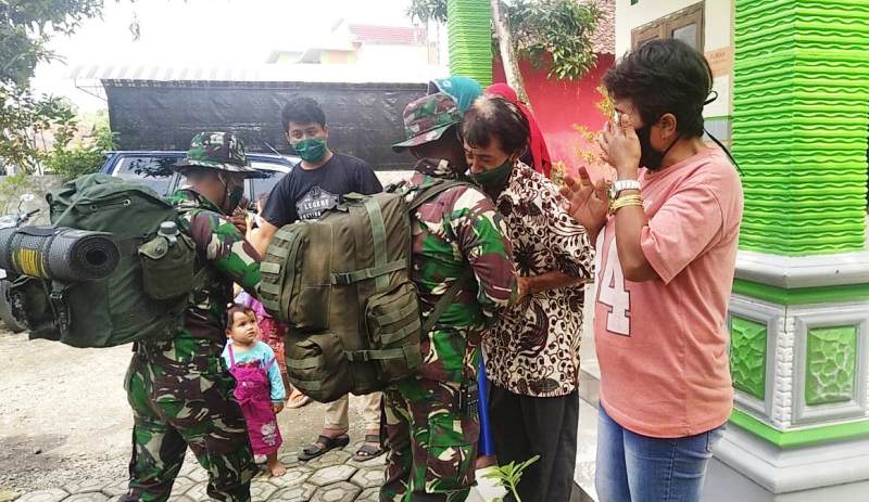 Pecah seketika tangis dari Suminah (59) dan Suramto (64), kedua orang tua asuh Satgas TMMD Reguler Pekalongan, warga asal Dukuh Sutosari RT. 01 RW. 04, Desa Pantirejo, Kecamatan Kesesi, Kabupaten Pekalongan, Jawa Tengah, saat dipamiti Slamet Tugas dan anggotanya. Selasa (14/4/2020).