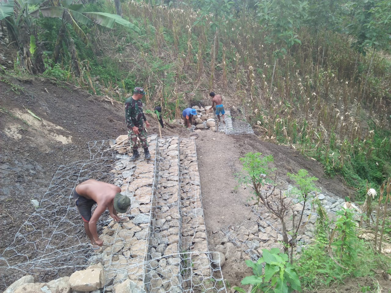 Kegiatan Bronjong isasi ini, pekerjaannya menyasar di tebing pinggir jalan makadam yang sedang dibuat dengan ketinggian 5 meter dan panjang 28 meter serta panjang 20 meter dengan ketinggian 6 meter. Kondisi saat ini pasca dikerjakan oleh Satgas tmmd reg 104 Kodim Pemalang selama 5 hari sudah menampakan hasilnya.