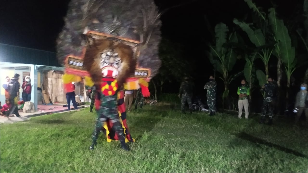Bojonegoro – Setelah melihat permainan Reog, Para Satgas TMMD ke-110 Kodim 0813/Bojonegoro yang menyaksikan kegiatan latihan Reog dibawah pimpinan Lamidjan, warga Desa Ngrancang, kecamatan Tambakrejo, Bojonegoro, ikut bermain ada yang menggunakan dan memakai topeng, baik topeng kecil dan juga topeng Merak yang berukuran besar dan tanpa diduga beberapa personil satgas yang ikut memakai topeng merak ini bisa menggerakkan tubuh meskipun harus menahan beban topeng merak yang begitu besar seolah tanpa beban,Jum’at(19/03/2021).