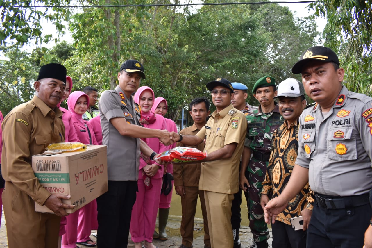 SIAK HULU newshanter.com – Selasa sore (31/12/2019), Kapolres Kampar AKBP Mohammad Kholid SIK bersama Ketua Cabang Bhayangkari Kampar Ny. Angela Kholid meninjau korban banjir di Kecamatan Siak Hulu.