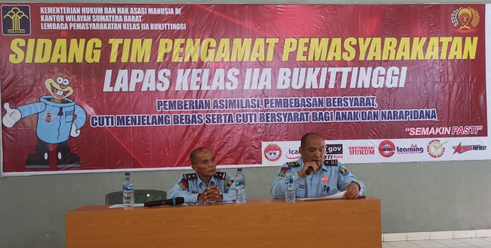 Bukittinggi , News Hanter.com – Lembaga Pemasyarakatan Kelas IIA Bukittinggi kembali melaksanakan Sidang Tim Pengamat Pemasyarakatan (TPP), dalam rangka pemberian asimilasi, pembebasan bersyarat, cuti menjelang bebas dan cuti bersyarat bagi Warga Binaan Pemasyarakatan (WBP) Lapas Kelas IIA Bukittinggi, Selasa (07/02/23).