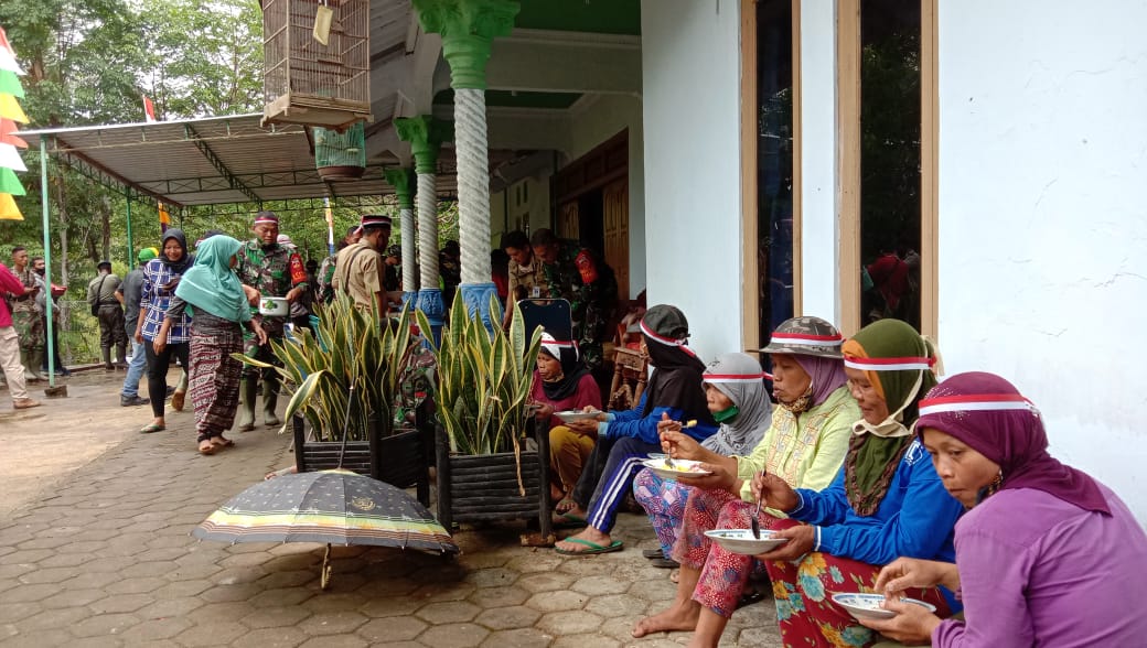 Purworejo — Satgas TMMD Reguler ke-109 Kodim 0708/Purworejo merasakan kenikmatan tersendiri saat makan bersama warga masyarakat di saat istirahat usai mengerjakan proyek pembangunan jalan rabat beton di lokasi TMMD di Dusun Wonosari, Desa Sedayu, Kecamatan Loano, Kabupaten Purworejo, Jawa Tengah, Selasa (06/10/2020).