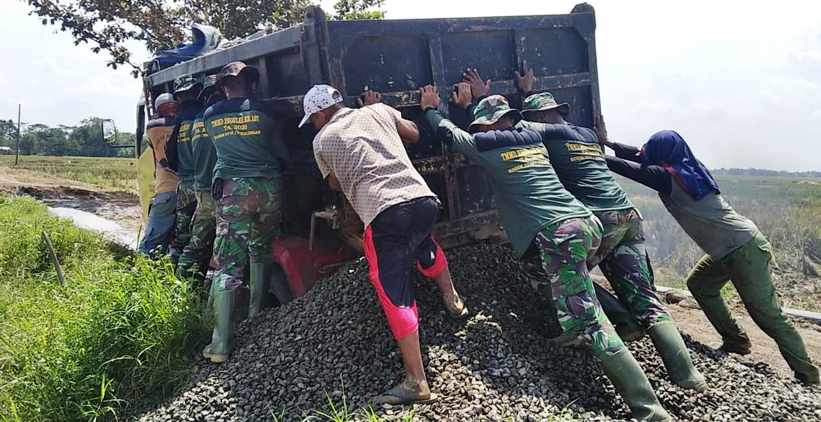 ‘’Untuk kejadian Rabu (08/04/2020), sebuah truk pembawa material kricak, harus mengalami kejadian serupa, yakni seusai bongkar material, terperosok di kubangan jalan berlumpur, hingga tidak bisa jalan,’’ ungkap Babinsa Sertu Sutrisno.