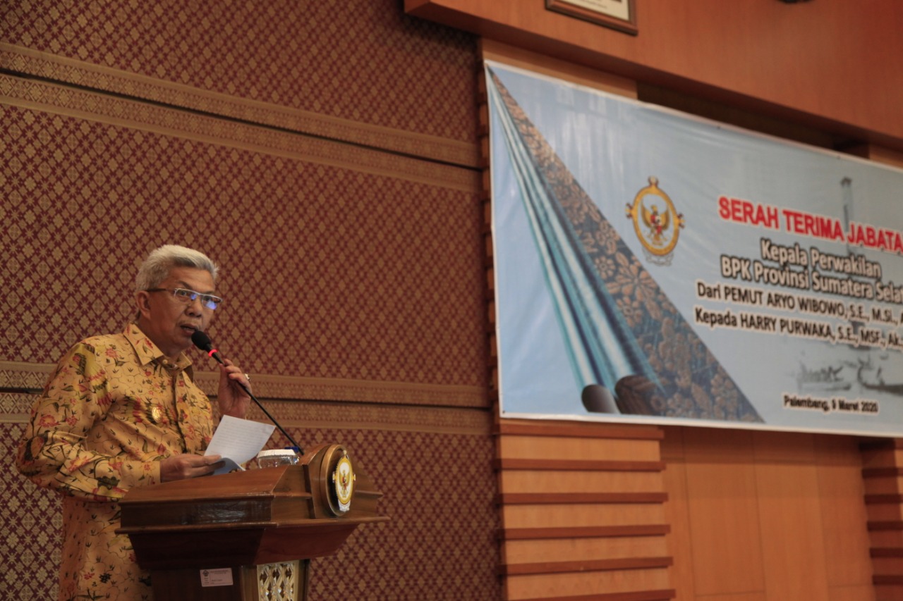 Palembang- newshanter.com.Wakil Gubernur Sumsel H. Mawardi Yahya menghadiri langsung serah terima jabatan Kepala Badan Pemeriksa Keuangan (BPK) Perwakilan Provinsi Sumsel di Kantor BPK Perwakilan Sumsel, Jalan Demang Lebar Daun Palembang, Senin (9/3/2020).