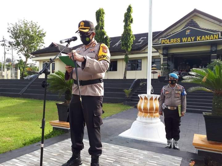 Kapolres Way Kanan AKBP Binsar Manurung selaku Inspektur upacara membacakan amanat Kapolri Jenderal Polisi Drs. Idham Azis, M.Si. bahwa operasi ini dilakukan dengan mengedepankan kegiatan preemtif dan preventif secara humanis, serta penegakan hukum secara tegas dan profesional.