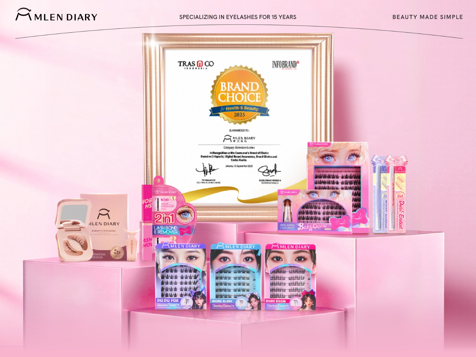 Penghargaan ini diselenggarakan oleh TRAS N CO Indonesia dan Infobrand.id, berdasarkan tiga aspek penilaian utama: digital brand awareness, brand choice, dan social media engagement. Pencapaian ini semakin menegaskan posisi MLEN DIARY sebagai pemimpin inovasi di industri bulu mata, sejalan dengan misi utamanya sejak awal berdiri — “Membuat kecantikan menjadi lebih mudah”.