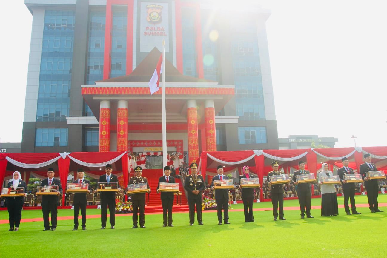 Pada upacara yang berlangsung penuh hikmat tersebut, Kapolda Sumsel Irjen A Rachmad Wibowo yang menjadi inspektur upacara menyerahkan penghargaan Kapolri kepada 14 tokoh Daerah Sumsel stake holder yang telah membantu dan berkontribusi terhadap pelaksanaan tugas kepolisian.
