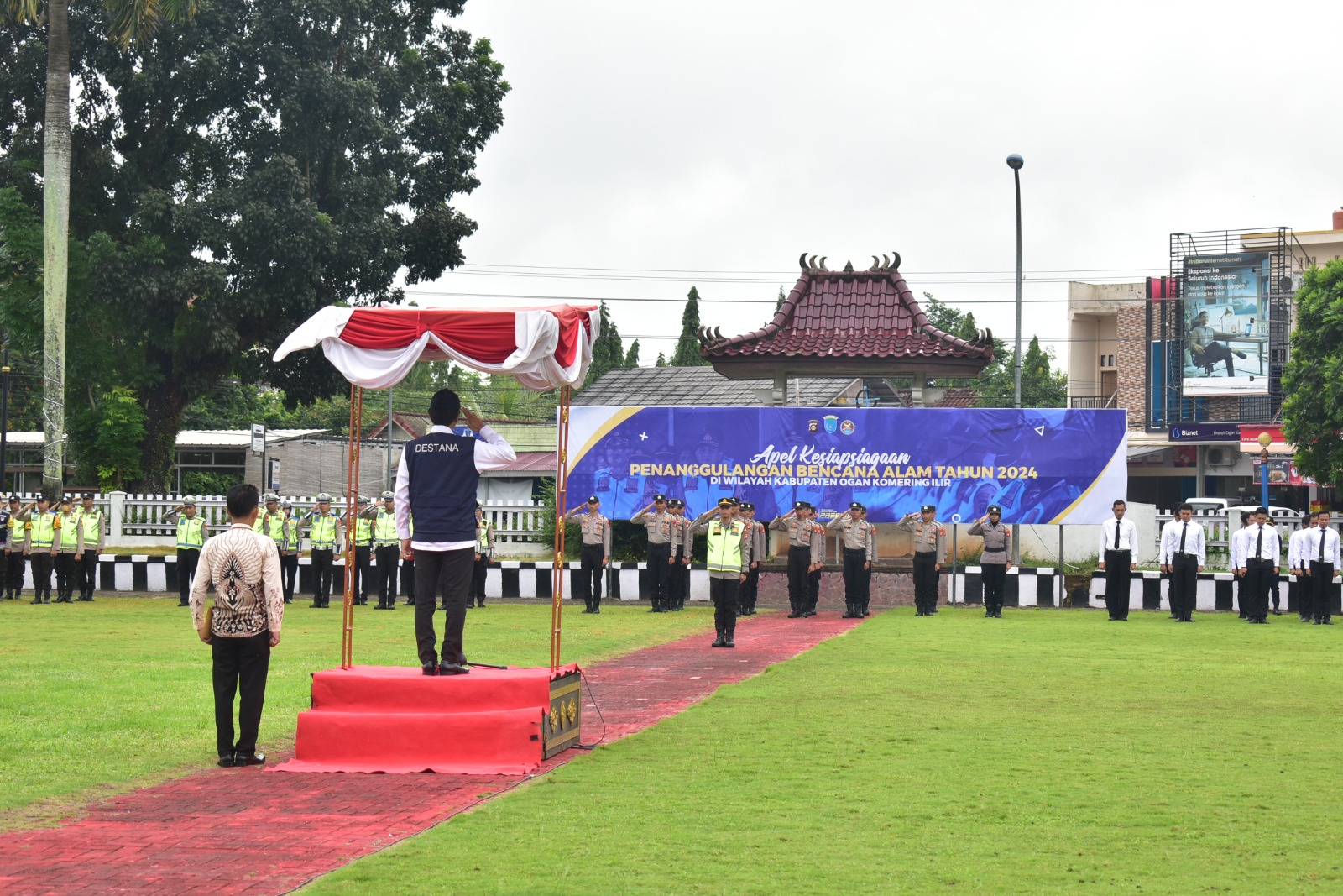 Apel gelar pasukan dan peralatan diawali dengan pengukuhan secara simbolis pemakaian topi penanggulangan oleh Pj. Bupati OKI, Asmar Wijaya kepada Satgas Penanggulangan Bencana dilanjutkan pengecekan pasukan dan peralatan bersama Forkopimda Kabupaten OKI.