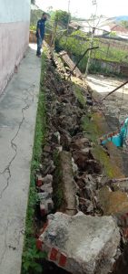 Hal itu disampaikan Junaidi salah satu warga yang pekarangan rumahnya dikotori oleh puing – puing reruntuhan pagar tembok yang diperkirakan sekitar 10 meter ambuk.