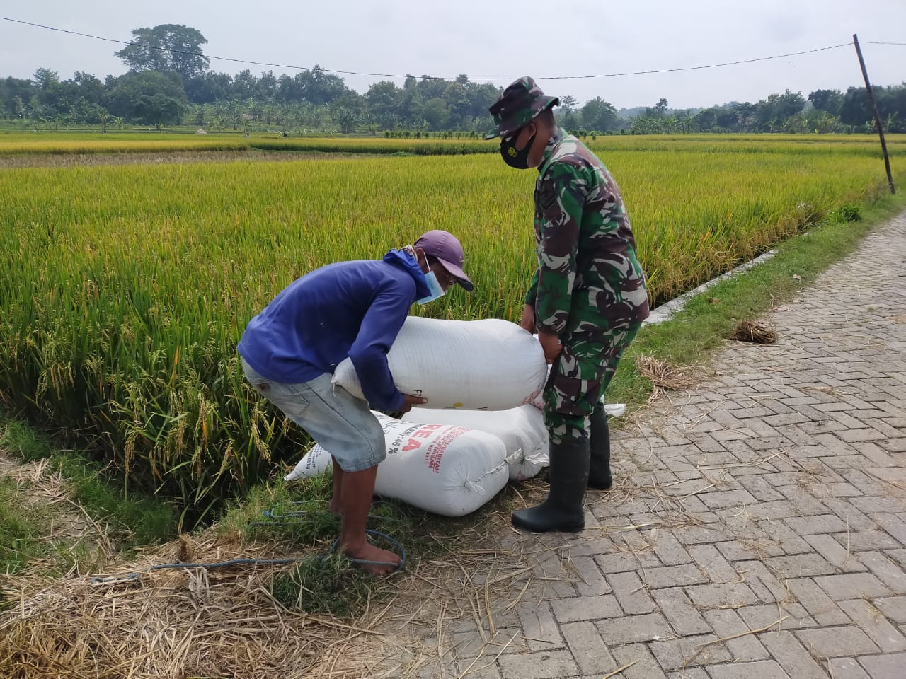Serda Lajahidin, salah satu Satgas TMMD ke-110 Kodim 0813/Bojonegoro nampak bersama petani membantu panen disalah satu sawah milik warga dan membantu angkat junjung gabah hasil panen.