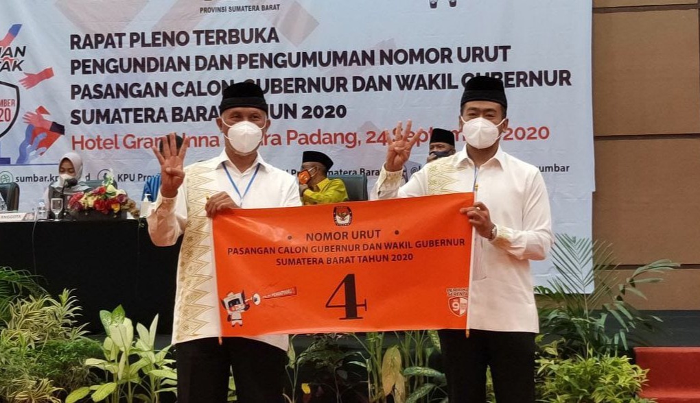 Padang, NewsHanter.com – Komisi Pemilihan Umum Daerah Sumatera Barat telah menetapkan nomor urut pasangan Calon Gubernur dan Wakil Gubernur yang akan bertarung di Pemilihan Gubernur Sumatera Barat Desember mendatang, Sabtu (26/09/20).
