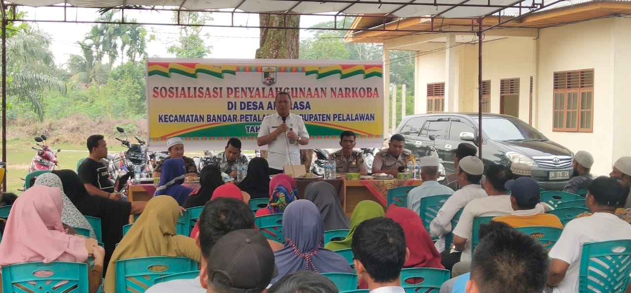 PELALAWAN, Newshanter.com – Pemerintah Desa (Pemdes) Angkasa Kecamatan Bandar Petalangan, Kabupaten Pelalawan, Riau menggelar Sosialisasi Penyalahgunaan Narkoba dan Sadar Hukum kepada Masyarakat setempat, yang digelar di depan Kantor Desa, Selasa (15/10/2019).