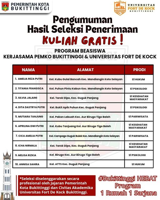 Setelah melewati proses seleksi maka ditetapkan 10 orang yang lulus seleksi Program Beasiswa Kerjasama Pemerintah Kota Bukittinggi dan Universitas Fort De Kock
