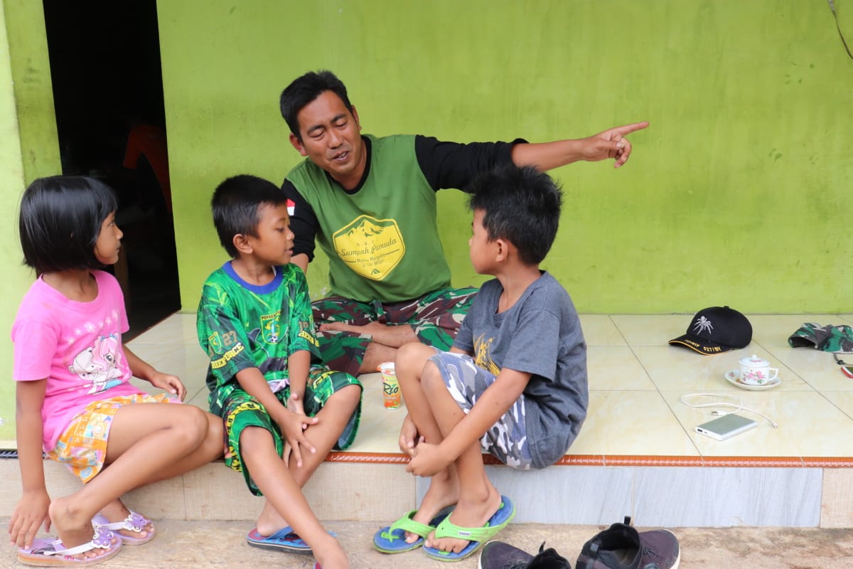 Praka Agus Tim Satgas TMMD Ke 107 Kodim Situbondo mendongeng bagi anak-anak meskipun di sela – sela istirahatnya di lokasi sasaran fisik TMMD.
