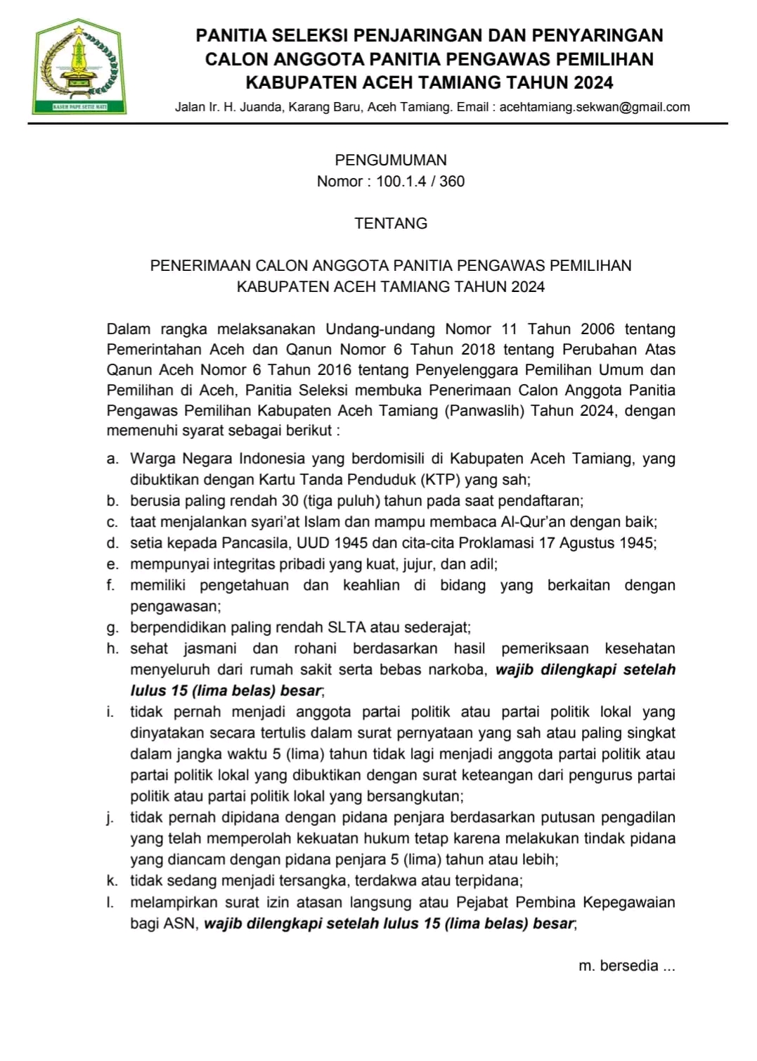 Dalam rangka melaksanakan Undang-undang Nomor 11 Tahun 2006 tentang Pemerintahan Aceh dan Qanun Nomor 6 Tahun 2018 tentang Perubahan Atas Qanun Aceh Nomor 6 Tahun 2016 tentang Penyelenggara Pemilihan Umum dan Pemilihan di Aceh, Panitia Seleksi membuka Penerimaan Calon Anggota Panitia Pengawas Pemilihan Kabupaten Aceh Tamiang (Panwaslih) Tahun 2024, dengan memenuhi syarat sebagai berikut: