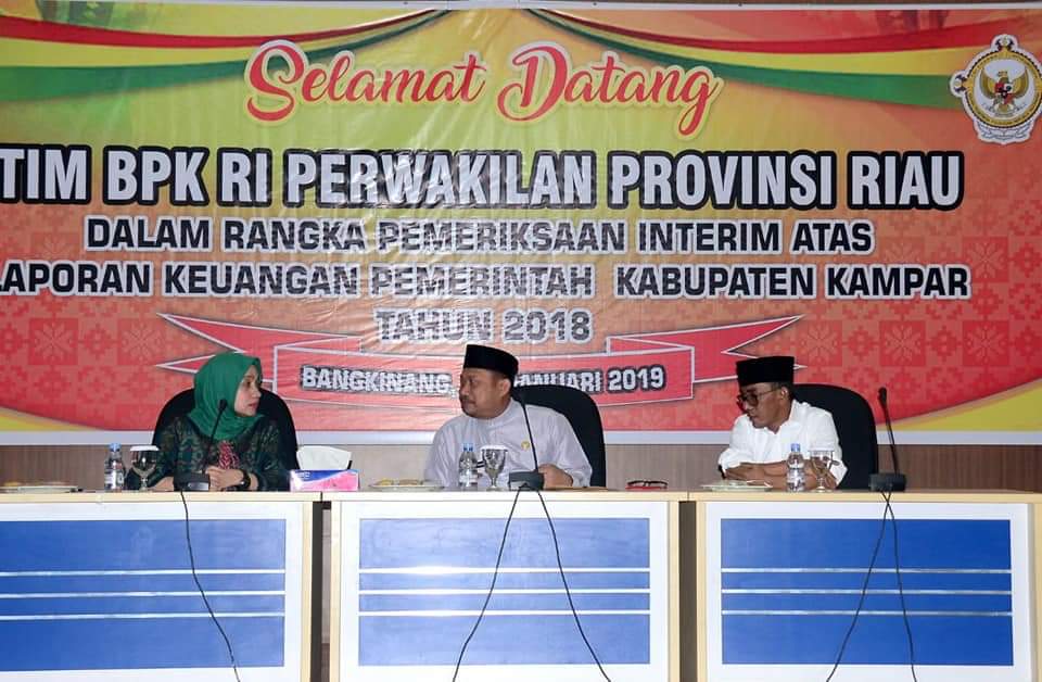 Begitu dikatakan Catur saat memberikan sambutan pada Entry Briefing BPK-RI Perwakillan Provinsi Riau pada pemeriksaan Interim atas laporan keuangan Pemerintah Kabupaten Kampar Tahun Anggaran 2018 yang dilaksanakan di Aula Kantor Bupati Kampar, Rabu (30/1). yang juga dihadiri oleh Sekretaris Daerah Kabupaten Kampar, Yusri, M.Si dan tim dari BPK RI Perwakilan Riau, Syafina Khairiah, Mardiana Julfianti, Brahmantyo dwi wahyuono dan Bapak Stephan Reja sembiring.