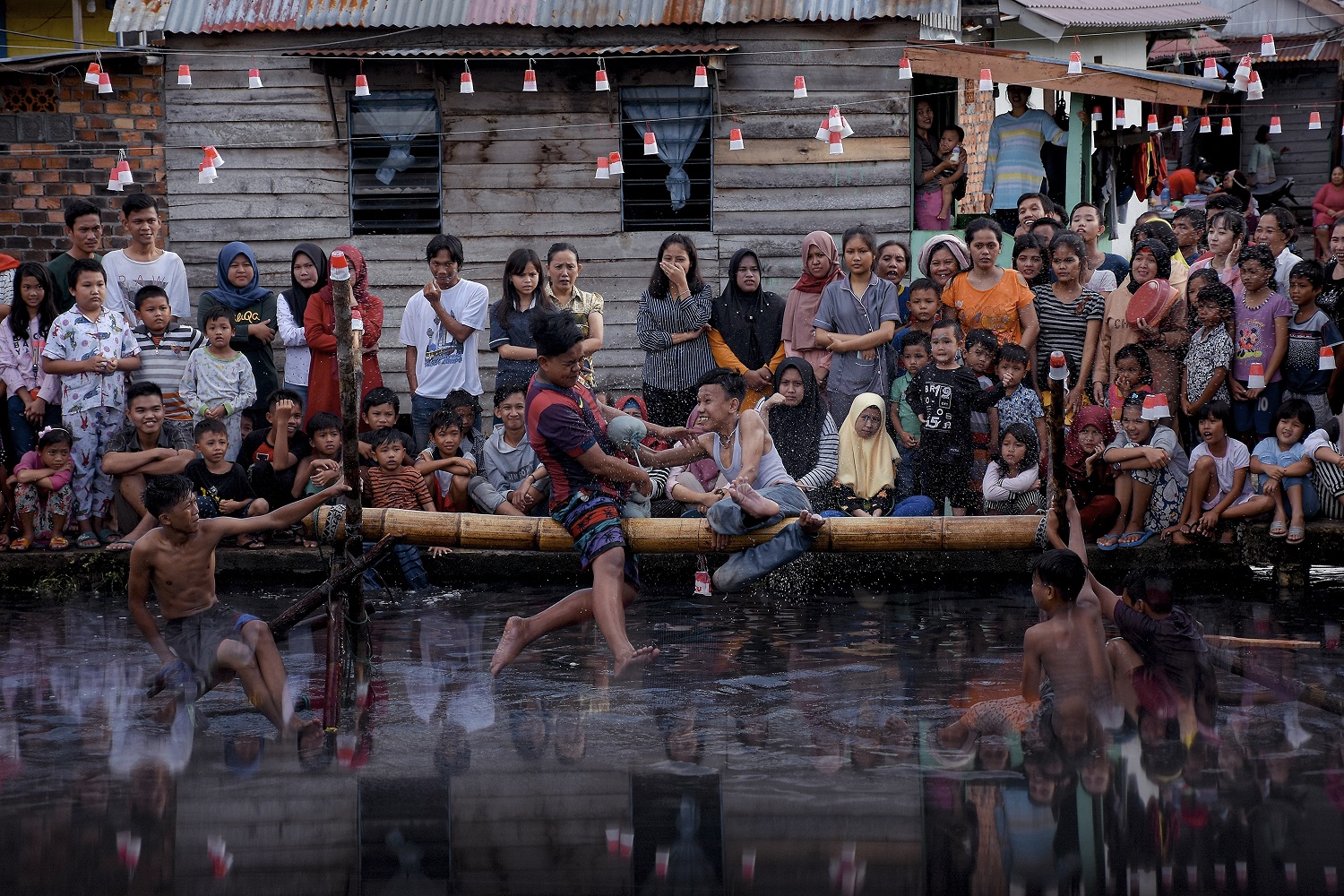 Pesta Rakyat di Hari Kemerdekaan – Beberapa warga tampak antusias mengikuti lomba Gebuk Bantal yang terselenggarakan di Kertapati kota Palembang (17/08). Perlombaan ini digelar warga sekitar untuk menyemarakkan hari kemerdekaan Republik Indonesia. Foto : News Hunter Online / Rizki Ananda Febrian