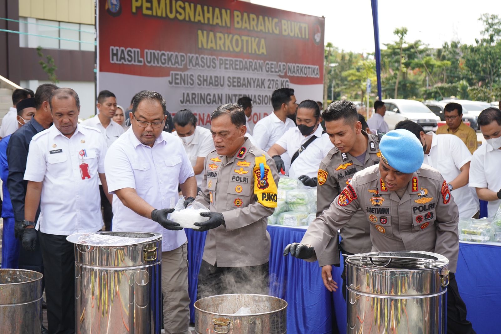 Pemusnahan 276 kilo sabu dilakukan dengan cara sabu dimasukkan dalam wadah yang diisi air yang dipanaskan, kemudian dilarutkan dan diaduk serta dicampur dengan cairan pembersih lantai.