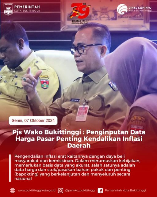 Bukittinggi, newshanter.com – Pjs Wali Kota Bukittinggi, H. Hani Syopiar Rustam, minta Tim Pengendali Inflasi Daerah (TPID) dan SKPD samakan persepsi dan siapkan strategi terbaik terhadap upaya pengendalian Inflasi Daerah, Senin (7/10/2024).