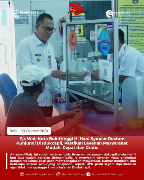 Bukittinggi, newshanter.com – Pjs Wali Kota Bukittinggi, tinjau langsung pelayanan di Kantor Disdukcapil, Rabu, (9/10/2024).
