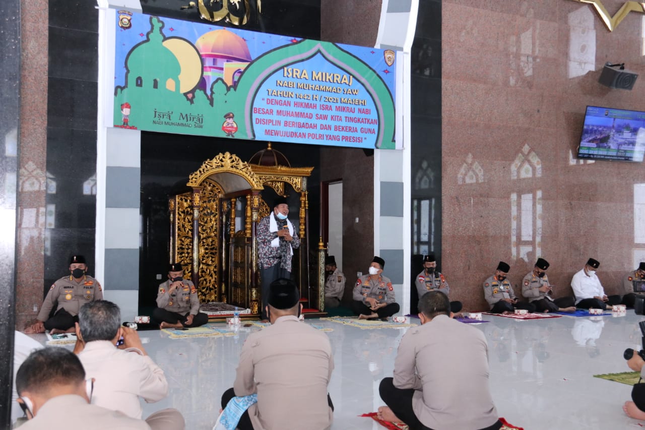 Palembang,newshanter.com -Kapolda Sumsel Irjen Pol Prof Dr Eko Indra Heri S MM didampingi Wakapolda Sumsel Brigjen Pol Rudi Setiawan Sik SH MH didampingi PJU dan Personel Polri dan Pns Polda Sumsel melaksanakan Peringatan Isra Mi’raj tahun 1442 Hijriah dimasjid Assa’adah Polda Sumsel, Rabu (24/03/2021) .dengan Tema”Dengan Hikmah Isra’ Mi’raj Nabi Besar Muhammad Saw kita tingkatkan disiplin Ber Ibadah dan bekerja guna mewujudkan Polri yang Presisi”.